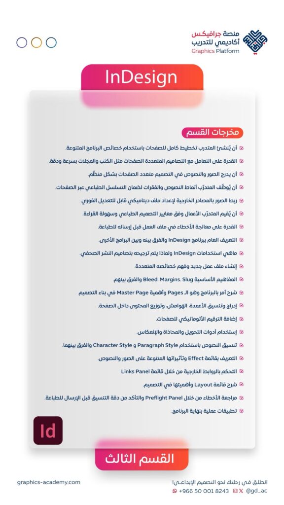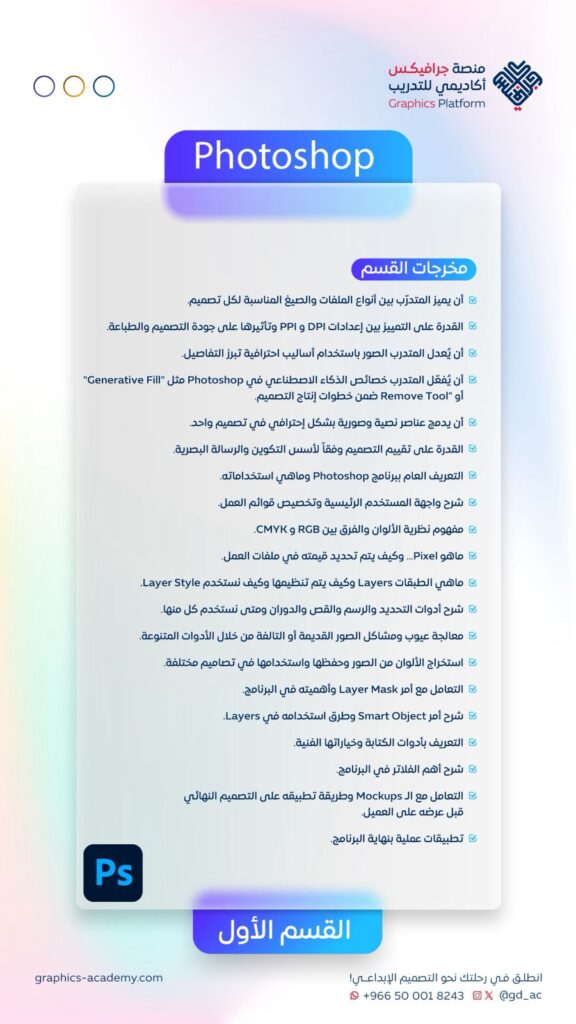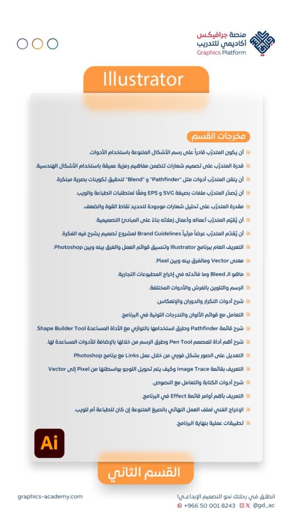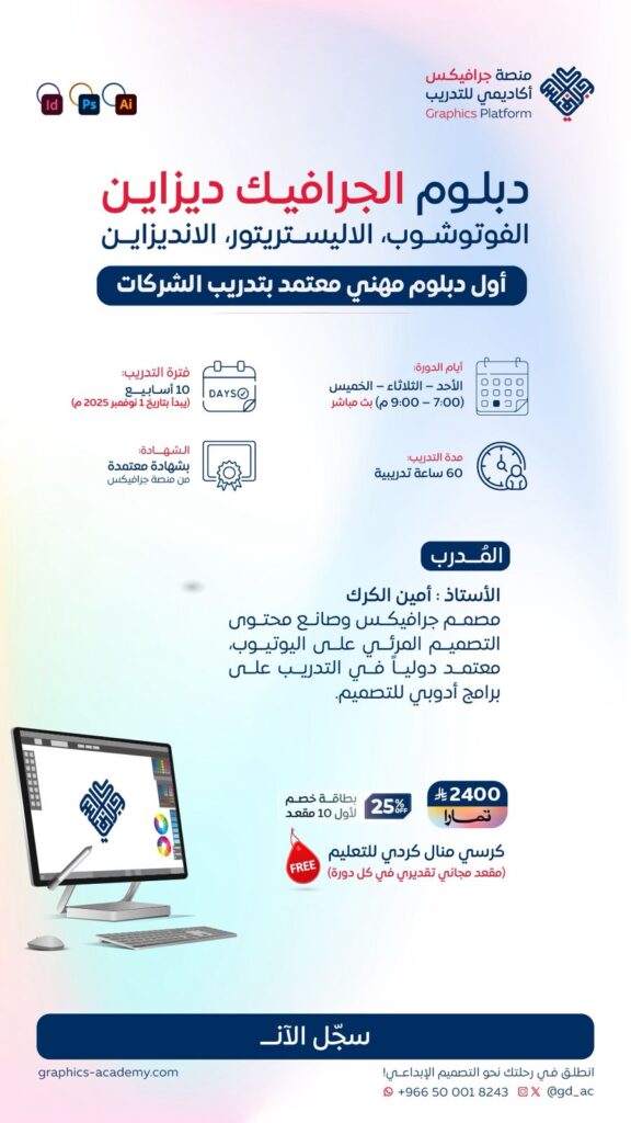 في عالمٍ يتسارع فيه تطور الأنظمة الرقمية وسلوك العملاء، أصبح الإبداع البصري أداة حاسمة لأي شركة أو رائد أعمال. هذا البرنامج يمنحك المهارات العملية والمعرفة التقنية لتصبح مصممًا قادراً على إنتاج أعمال احترافية تُنافس محليًا وعالميًا.